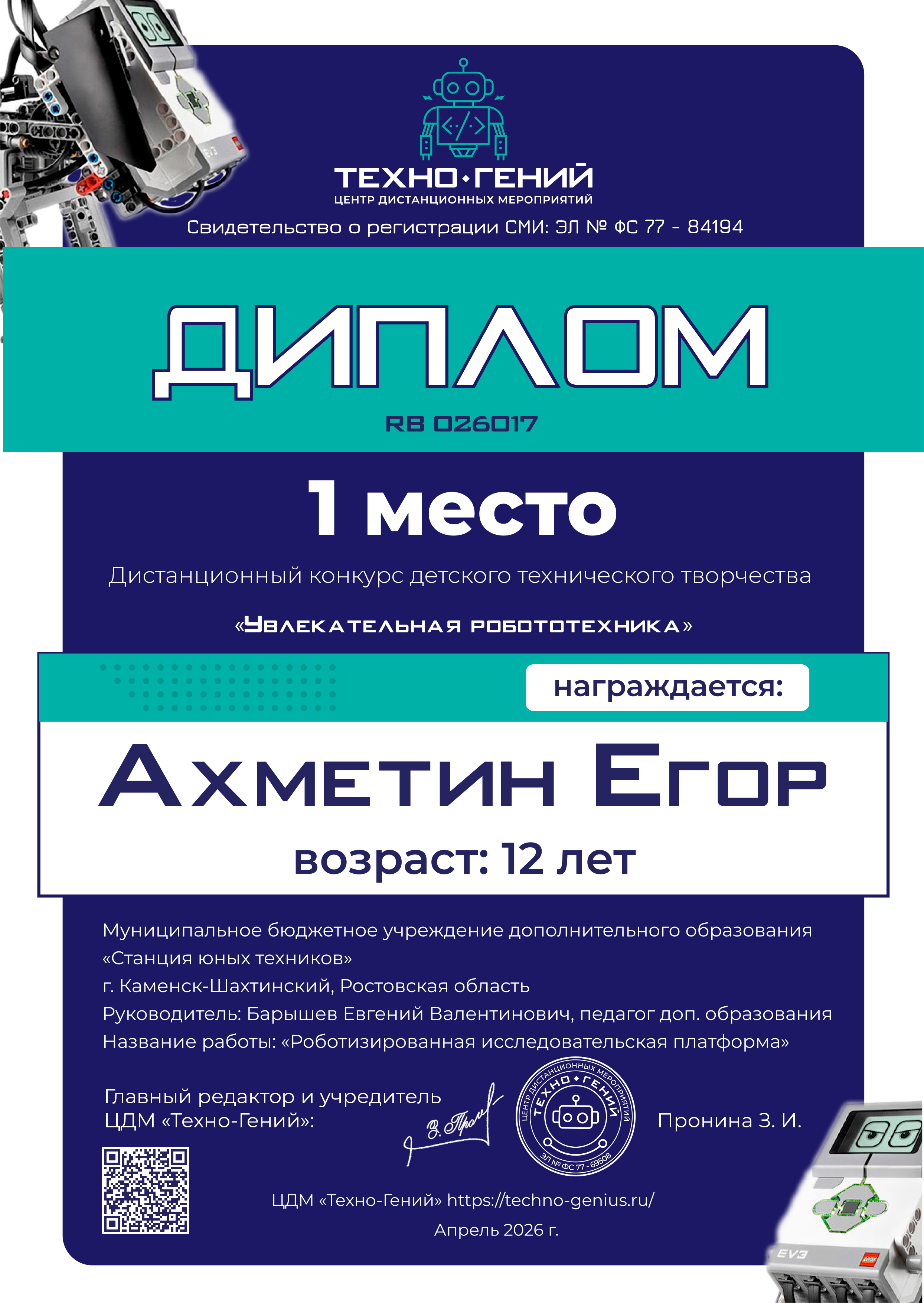 Ахметин Егор, «Роботизированная исследовательская платформа». Конкурс: Увлекательная робототехника.