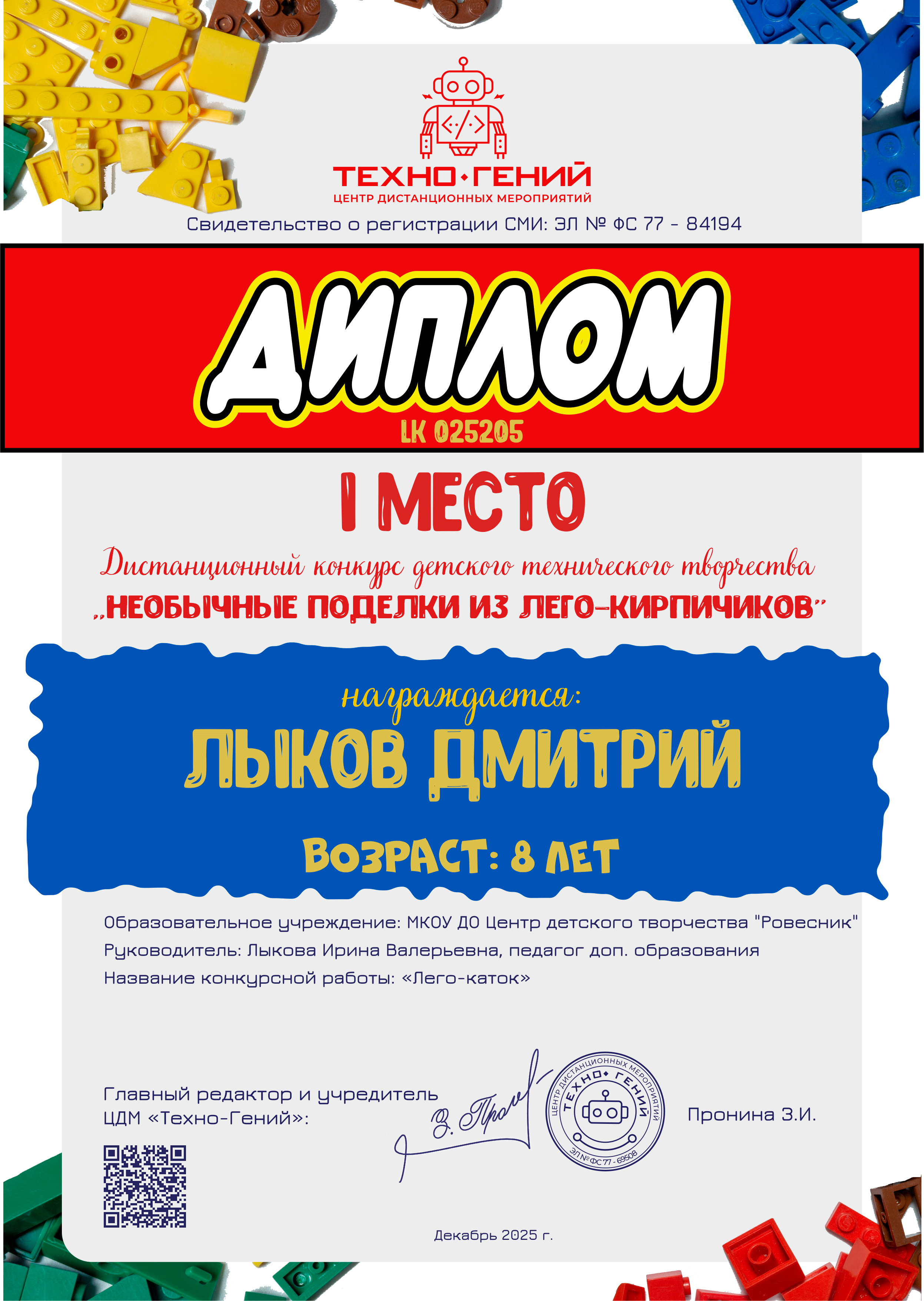 Лыков Дмитрий, «Лего-каток». Конкурс: Необычные поделки из лего-кирпичиков.