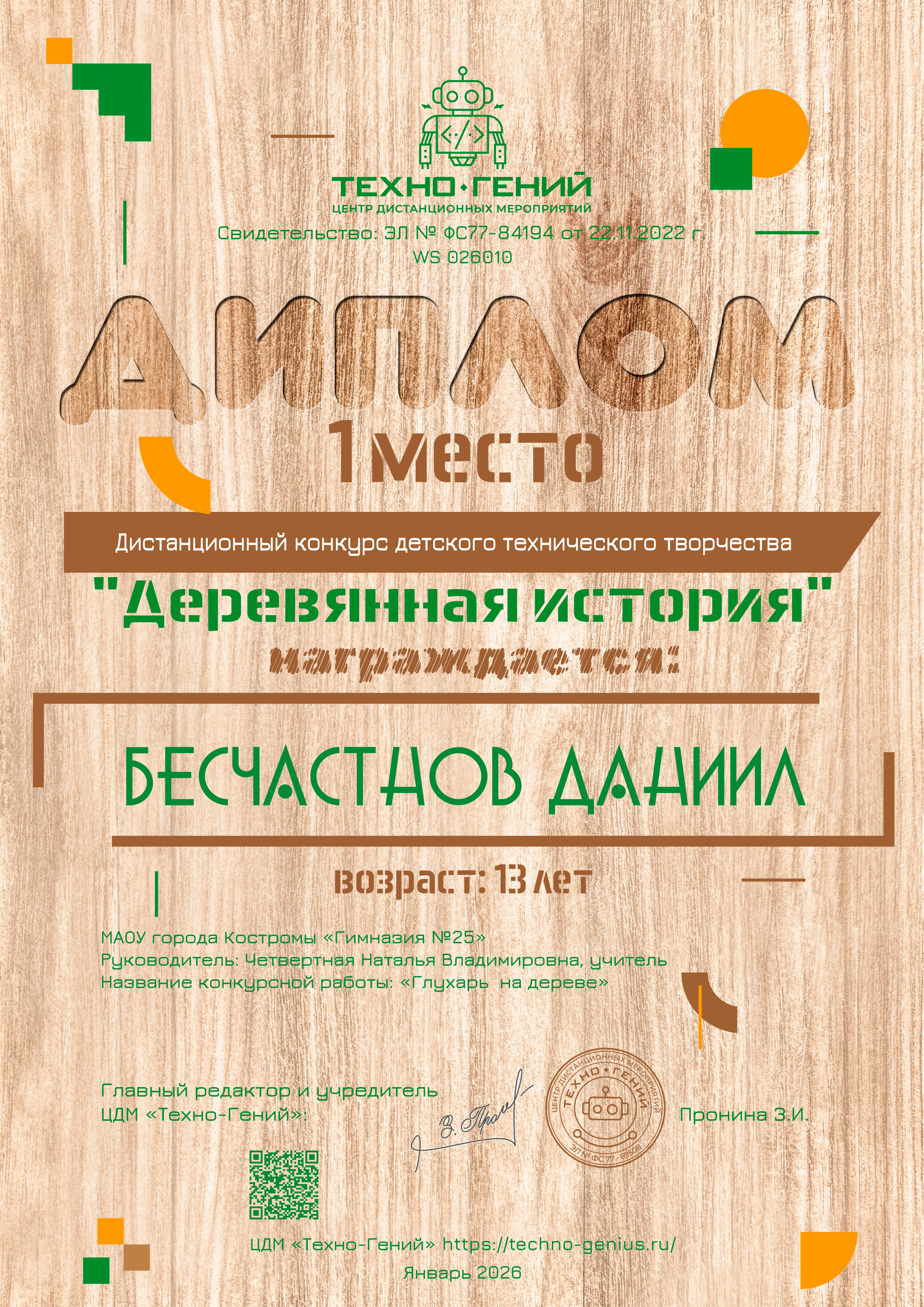 Бесчастнов Даниил, «Глухарь на дереве». Конкурс: Деревянная история.