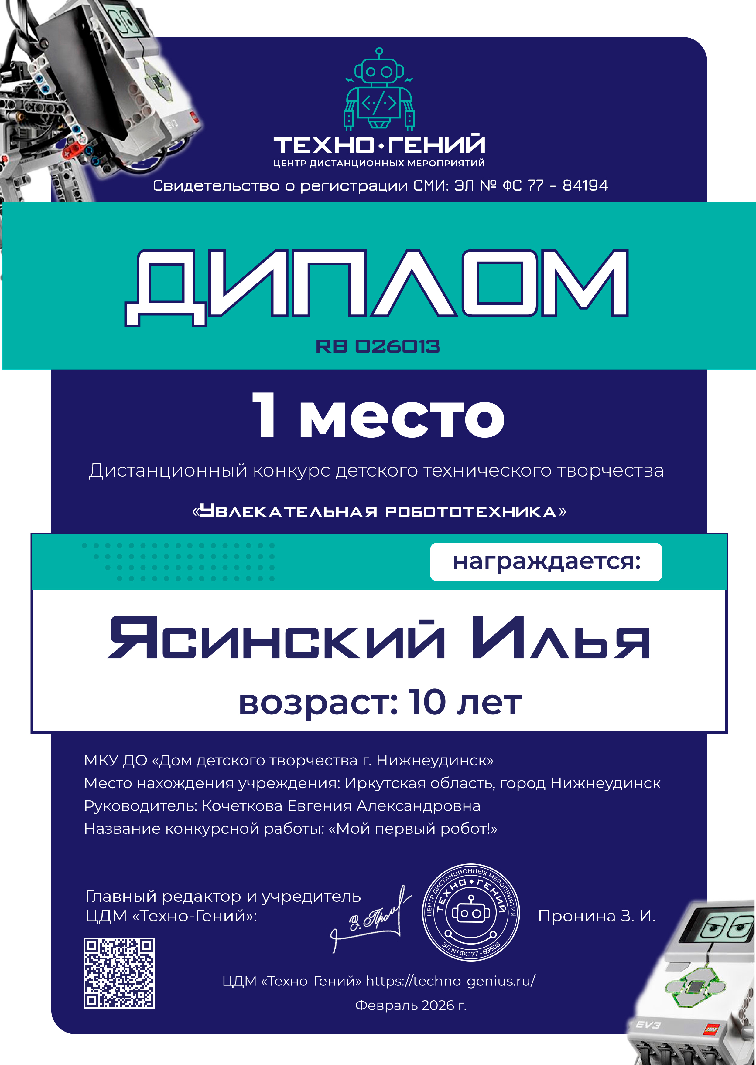 Ясинский Илья , «Мой первый робот!». Конкурс: Увлекательная робототехника.