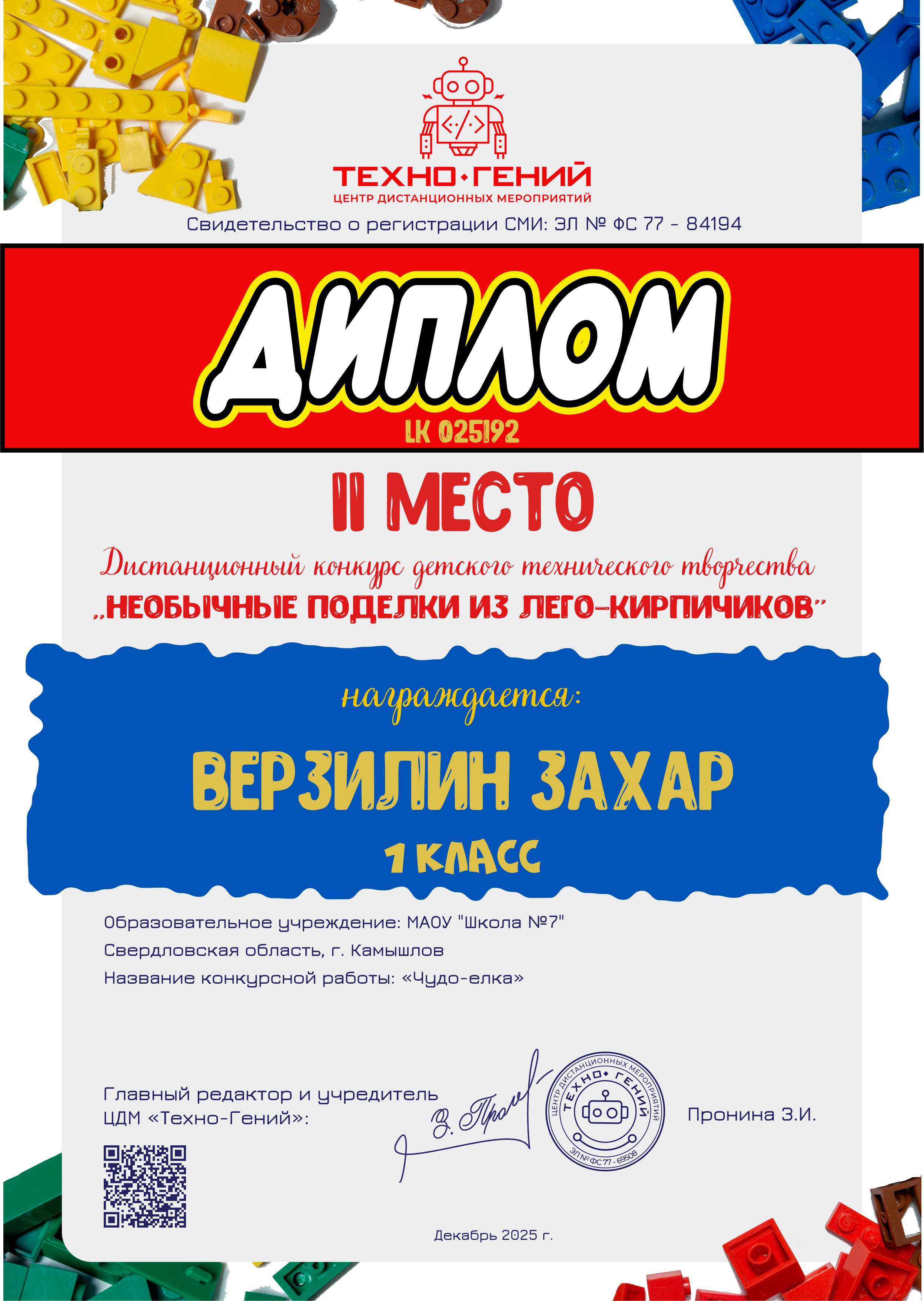 Верзилин Захар, «Чудо-елка». Конкурс: Необычные поделки из лего-кирпичиков.