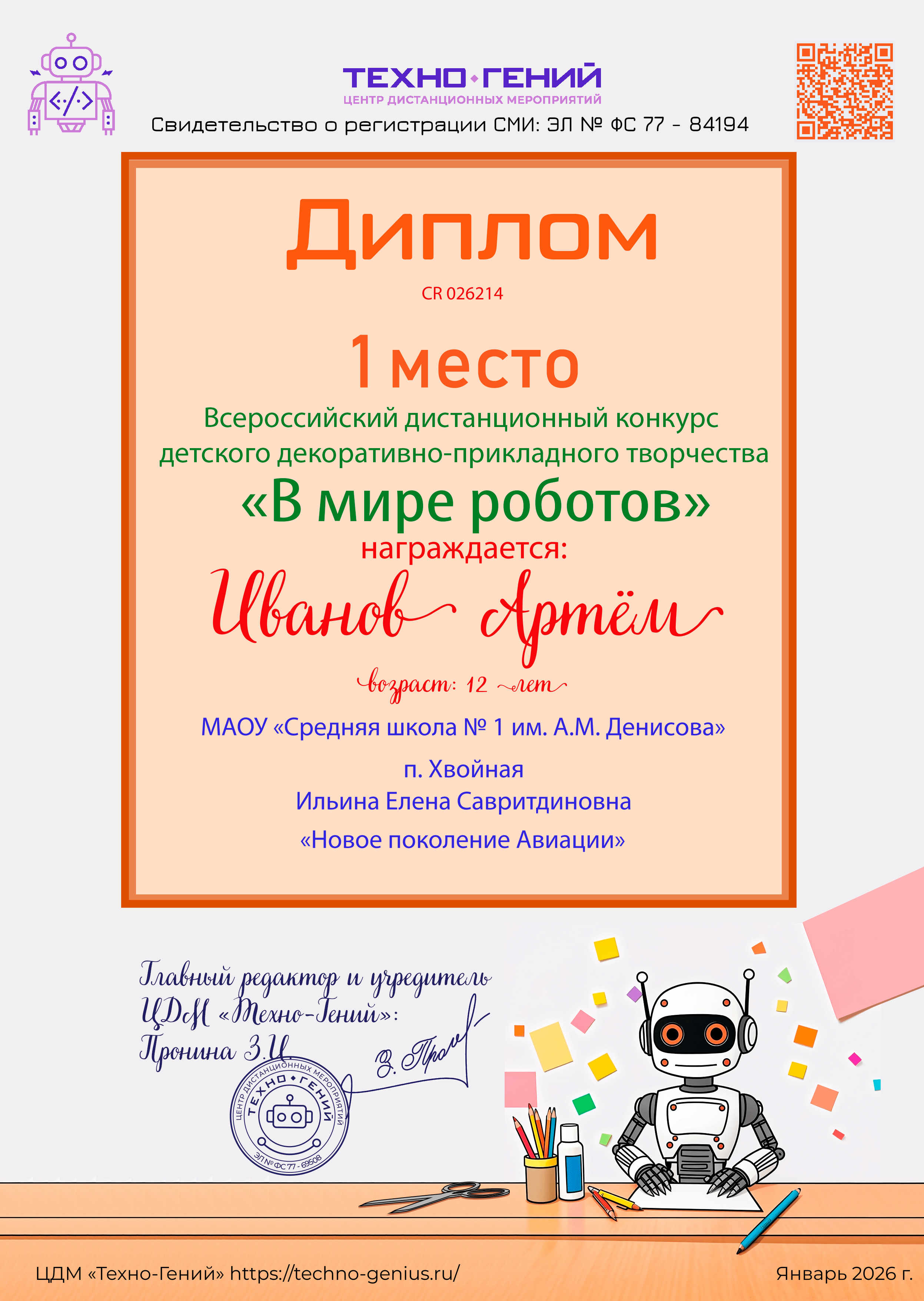 Иванов Артём, «Новое поколение Авиации». Конкурс: В мире роботов.