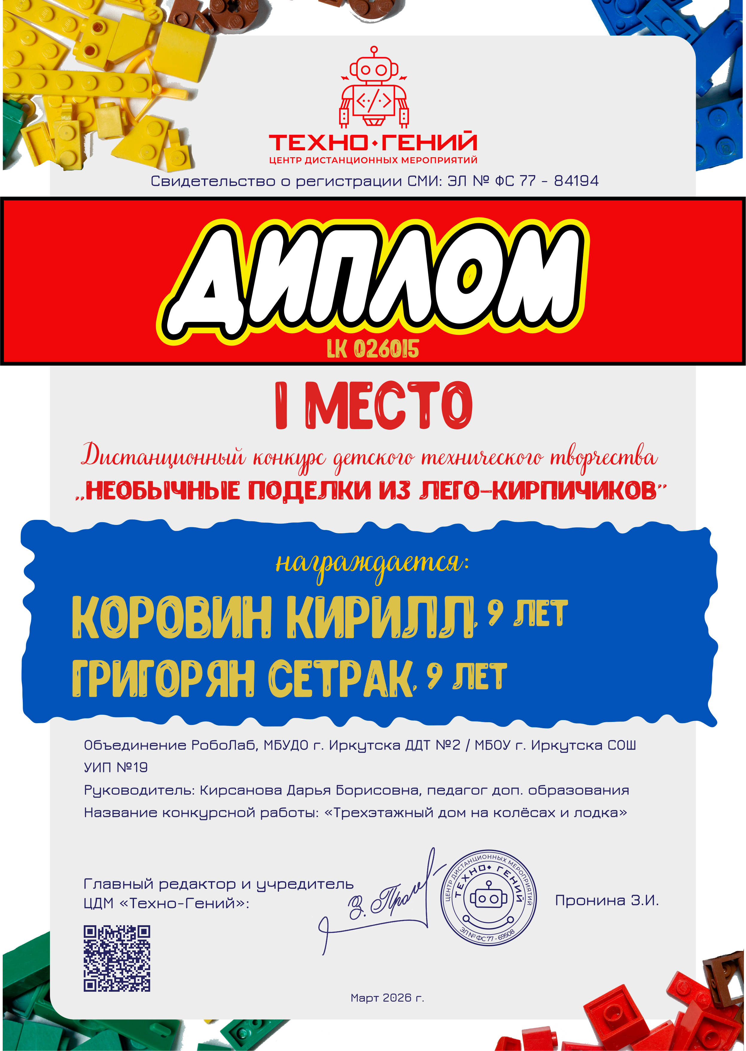 Коровин Кирилл, Григорян Сетрак, «Трехэтажный дом на колёсах и лодка». Конкурс: Необычные поделки из лего-кирпичиков.